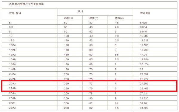 22號槽鋼22#a每米理論重量是:24.999 kg/米;22#b每米理論重量是:28.453 kg/米;數據如下: